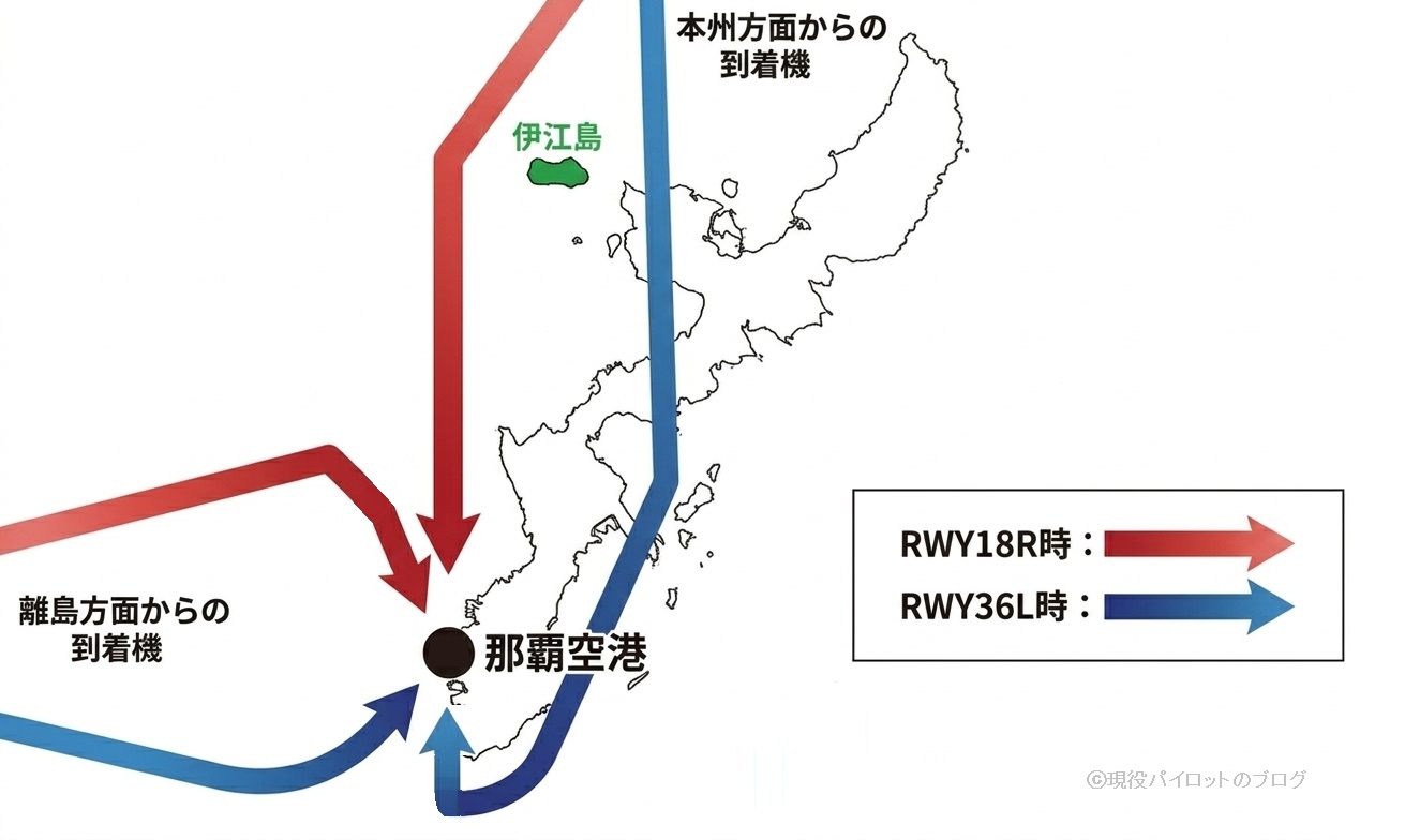Visual Approachは任意の経路を飛行できますが、騒音に配慮して沖縄の陸地の上空は飛ばないこととなっています。